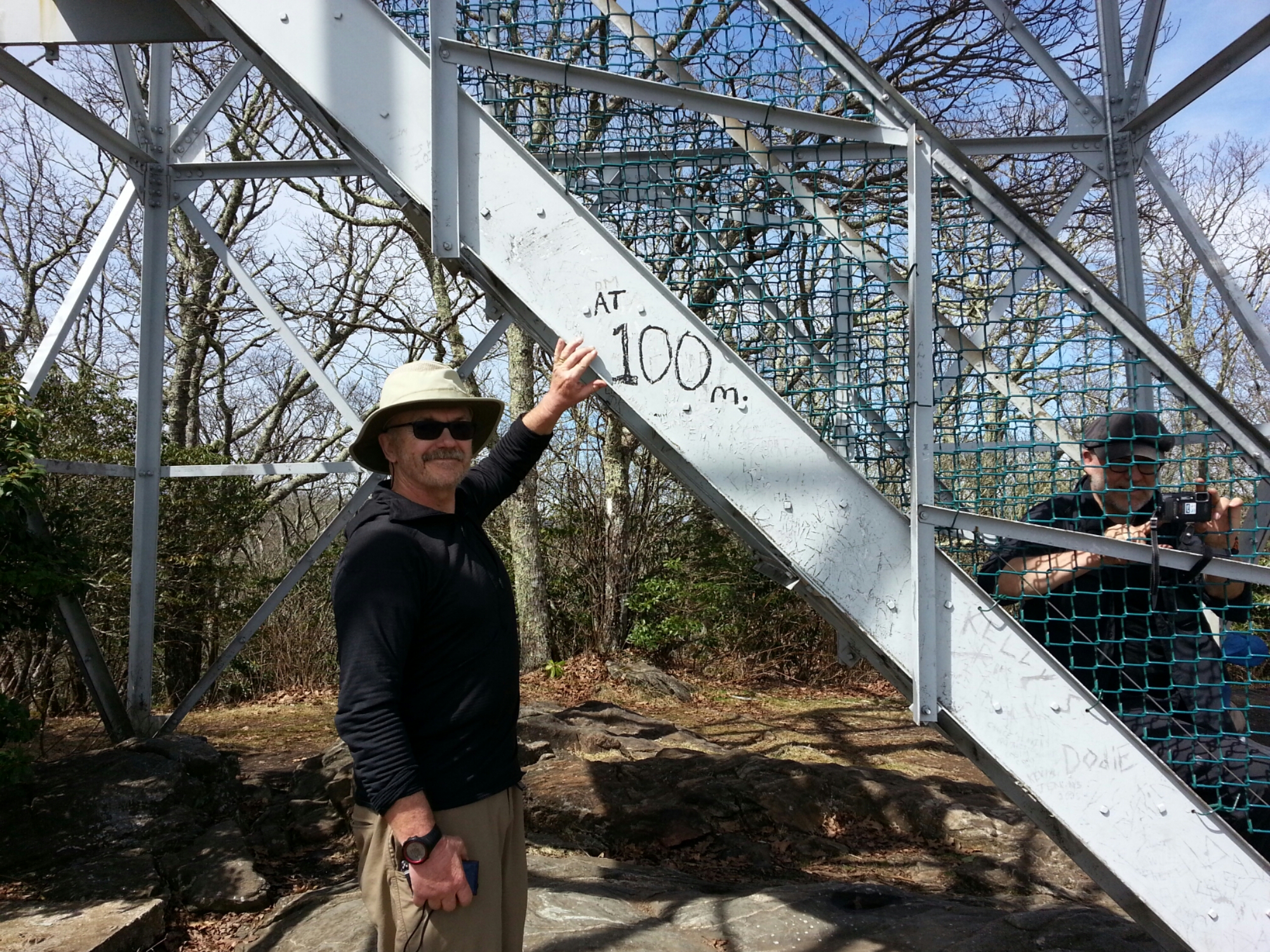Today’s highlights were the 500 foot, very vertical climb up Albert Mountain, and to reach the 100 mile point at the fire tower on top. It was strenuous for me, but I felt great to have done it, and the afternoon flew by from there.